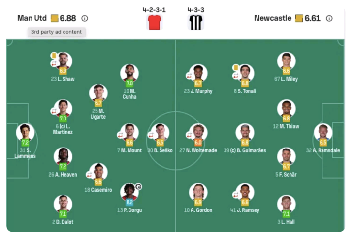 全场曼联控球率仅38%,却以教科书级的防守反击战术惊艳全场。利桑德罗·马丁内斯与新人海文组成的防线固若金汤,多次力挽狂澜;门将拉门斯高接抵挡,3次神扑力保城门不失。阿莫林的临场调度更显老辣,齐尔克泽与约罗的上场加固了防线,最终将胜果守至终场哨响。